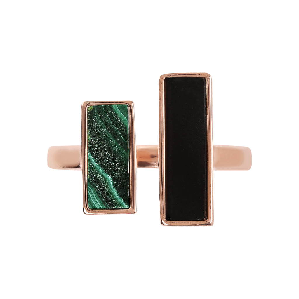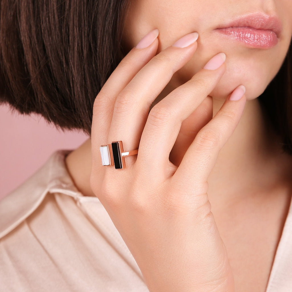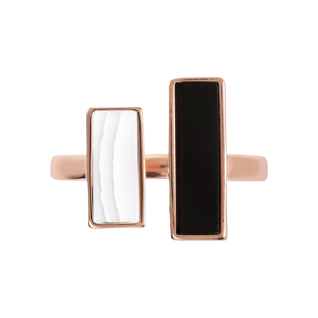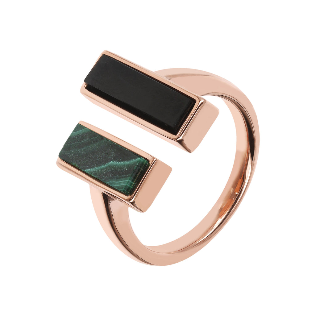 The Alba hard stone ring in two-tone version combines the eternal charm of black onyx with white agate striated or malachite: stones with character, unmistakable colours and patterns and elongated cut. Match this Golden Rose 18kt rose gold plated ring with the other jewels of the collection.