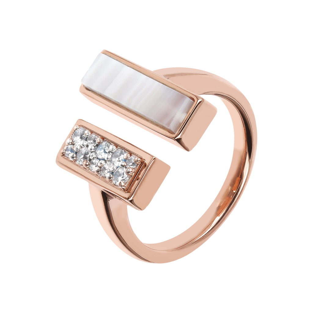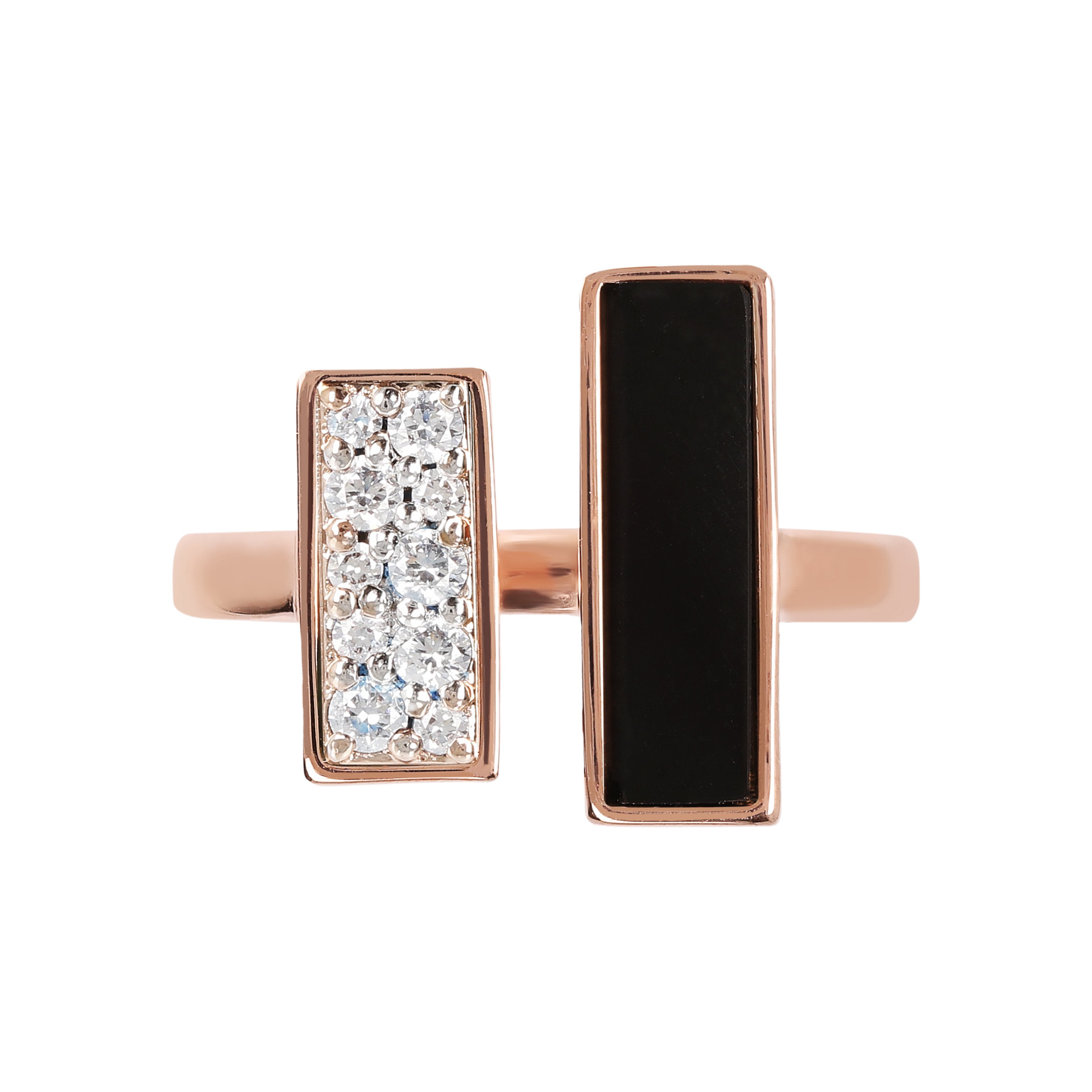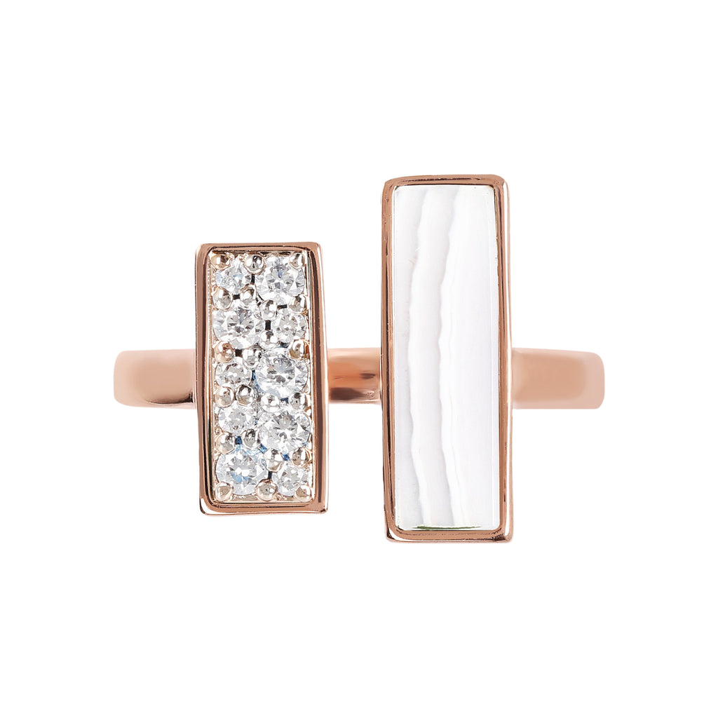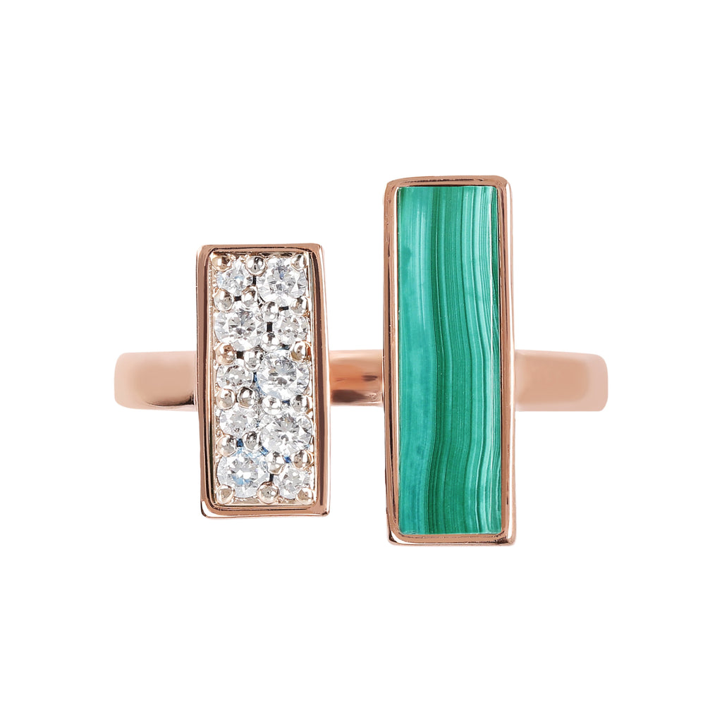 Alba hardstone ring in two-tone version combines the eternal charm of black onyx or malachite with cubic zirconia: stones with character, unmistakable colours and patterns and elongated cut. Match this jewel in Golden Rose, 18kt rose gold plated, with the other jewels of the collection.