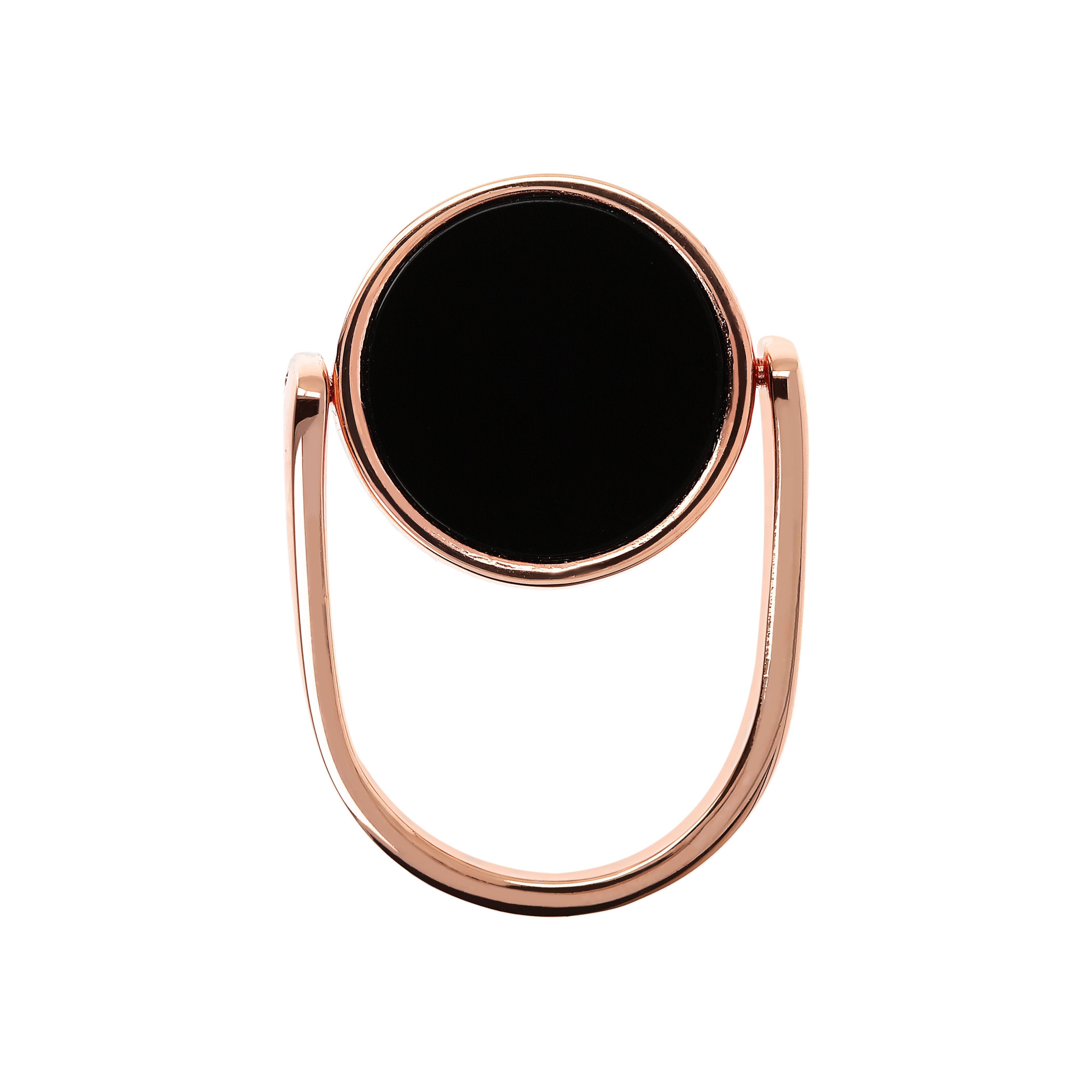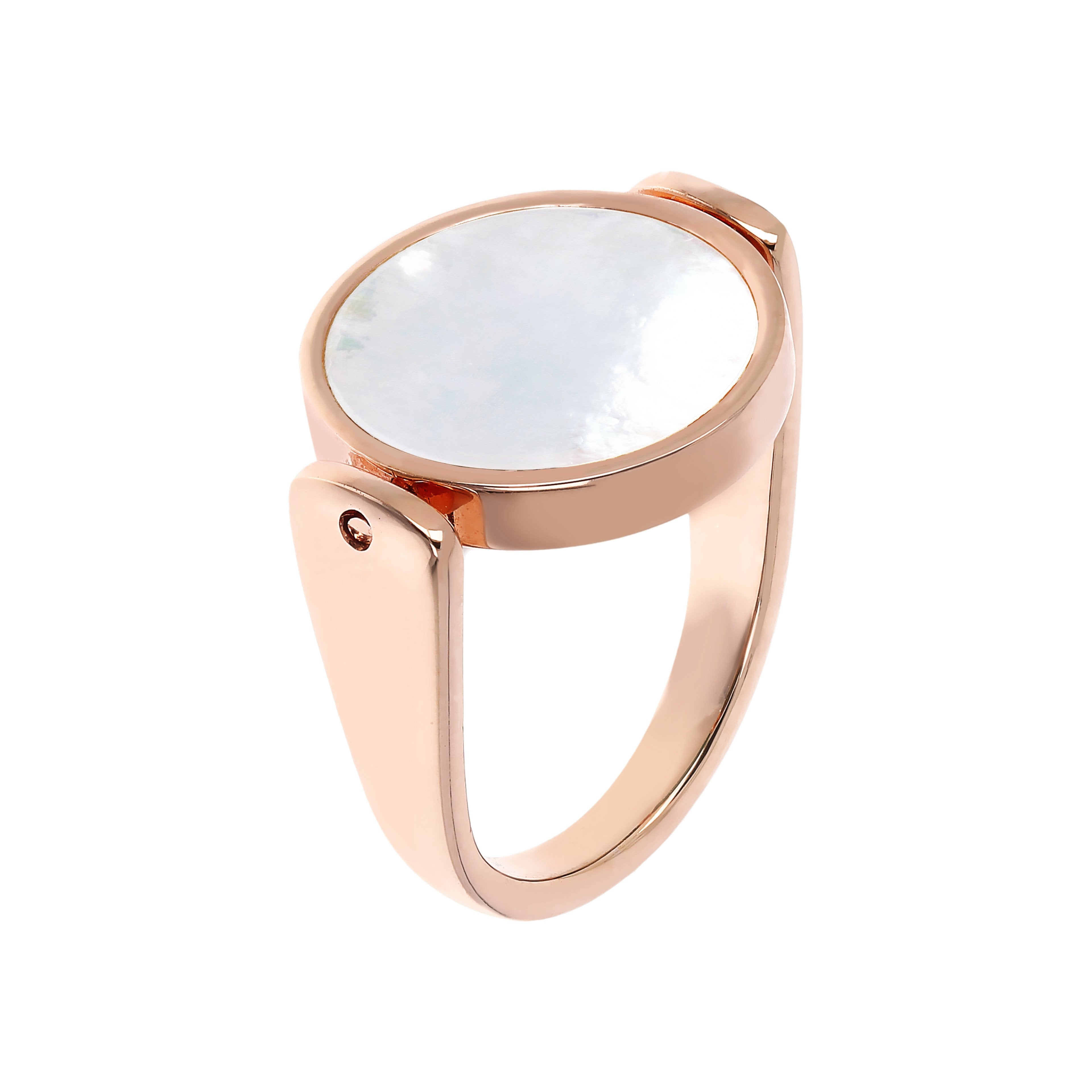 The Alba collection is enriched by the mini version of the reversible ring with disc in natural stone or white mother of pearl. An 18K rose gold plated jewel with essential volumes, ideal to wear every day. Match it with the matching necklace or with the other jewels of the collection.