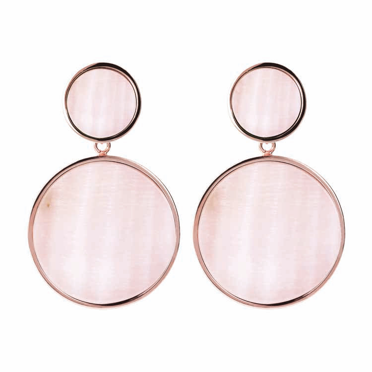 These dangle earrings are an evolution of the classic Alba jewellery: two discs, one small and one large, in natural stone or mother of pearl and 18kt, rose gold plated Golden Rose base. Elegance and style in one perfect piece of jewellery to wear every day. Pair them with the coordinating necklace, rings and earrings from the collection.