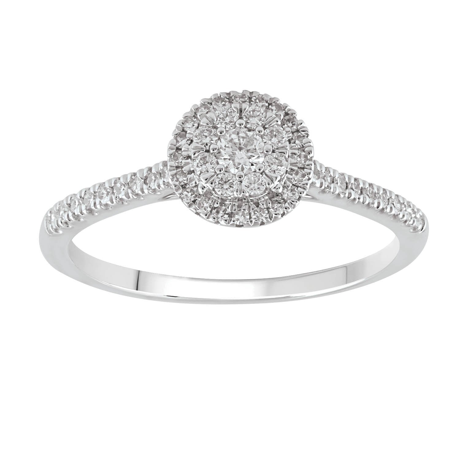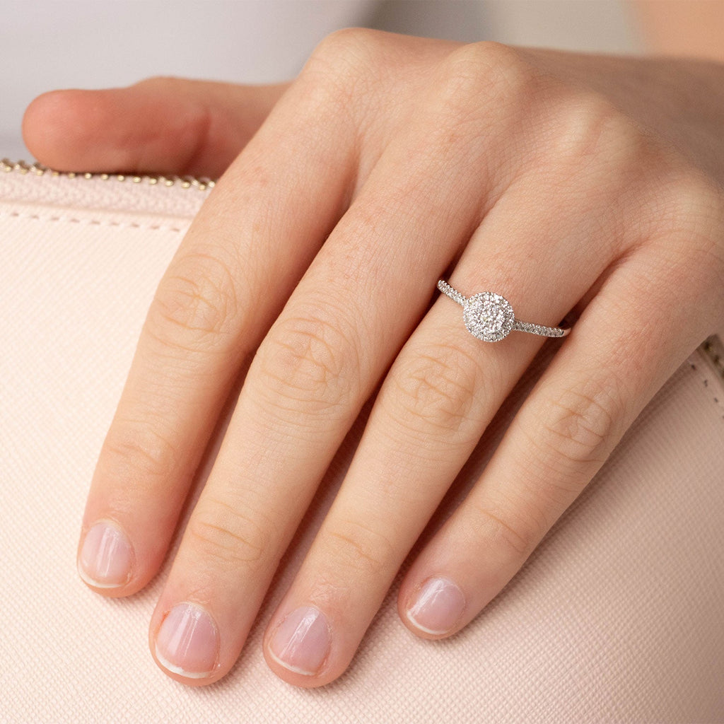 Thinking of popping the question? This gorgeous diamond Cluster Ring is the perfect choice. Features 47 diamonds, with a total diamond weight of 0.25 carats set in 9K White gold.