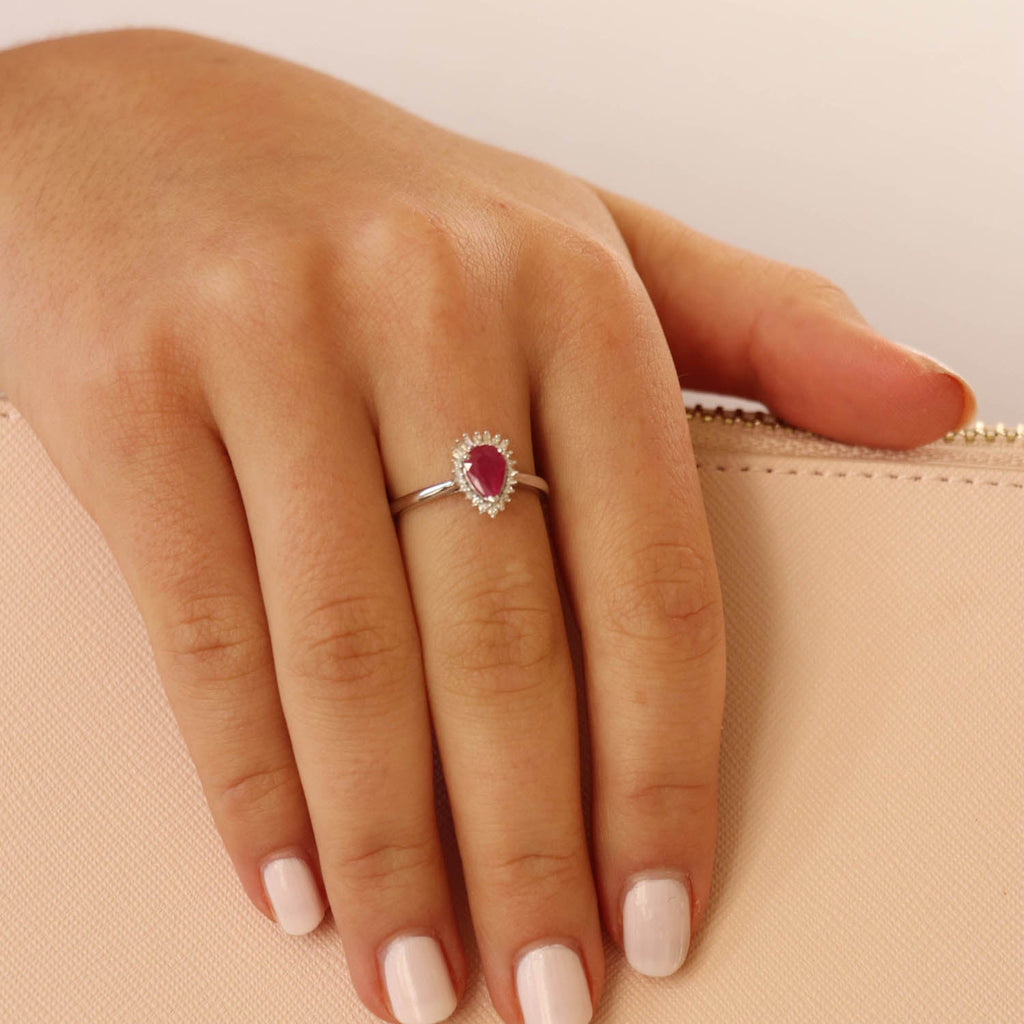 Pear Ruby Ring with 0.08ct Diamonds In 9K White Gold