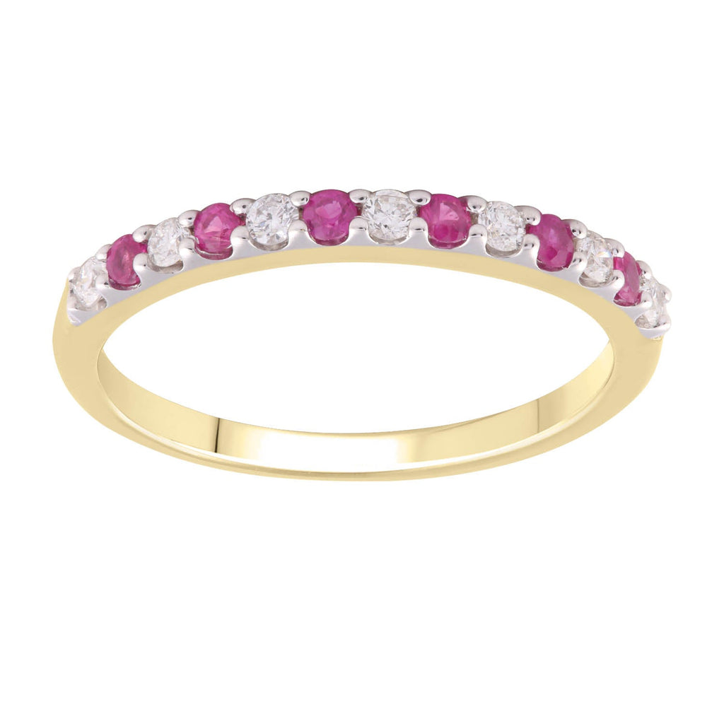 Looking at adding that 'wow' piece to your jewellery collection? This Ruby Ring is the perfect choice. Featuring 13 diamonds, with a total diamond weight of 0.15 carats set in 9K Yellow Gold.