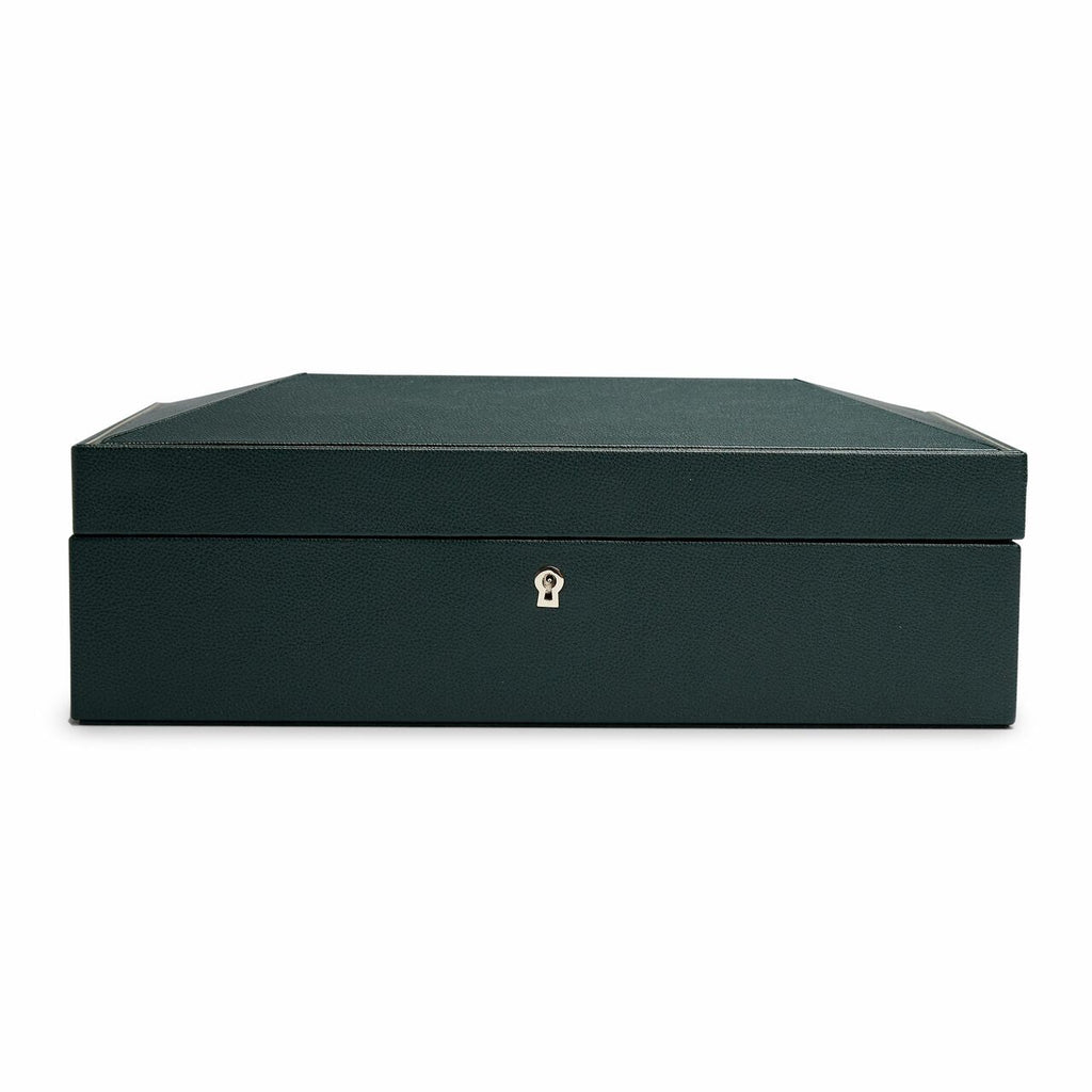 Handmade throughout, British Racing melds the green international motor racing colour of the UK’s cars raced in Ireland in the early 1900’s with a revolutionary quad angled panelled lid. Fine work detailing includes hand-pressed gold foil lines on vegan friendly pebble-grained leather. Gold hardware accents throughout with cushion close hinges. BRG, another design first from WOLF. Protect your watches in style in our 8 piece watch box with storage.