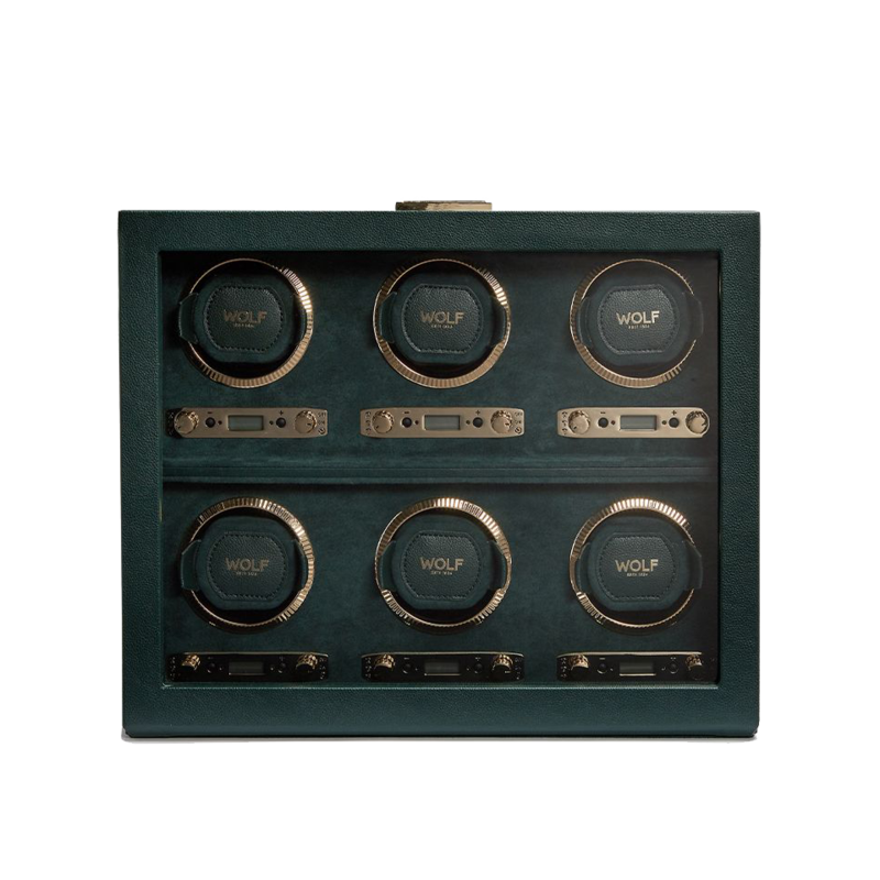 Handmade throughout, British Racing melds the green international motor racing colour of the UK’s cars raced in Ireland in the early 1900’s with a revolutionary quad angled panelled lid. Fine work detailing includes hand-pressed gold foil lines on vegan friendly pebble-grained leather. Gold hardware accents throughout with cushion close hinges and fluted bezel. BRG, another design first from WOLF. Take your watches for a spin in the 6 piece watch winder.