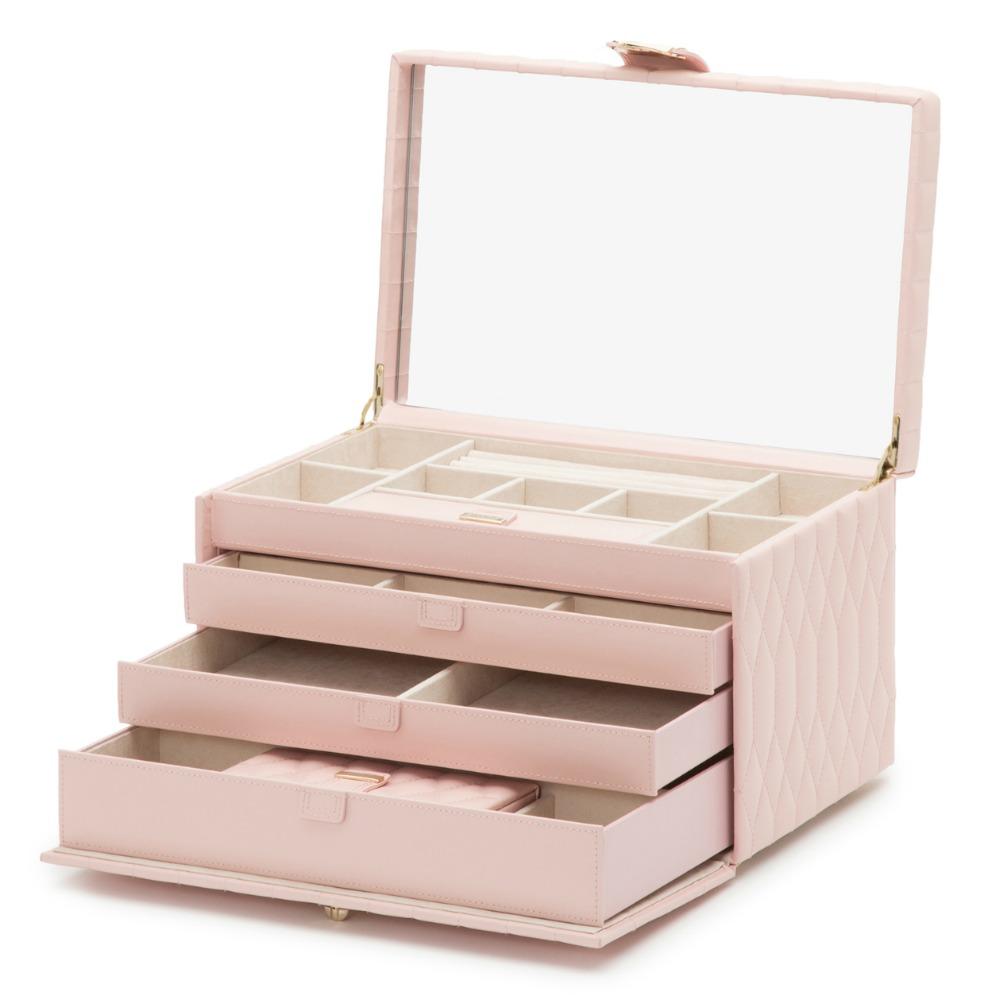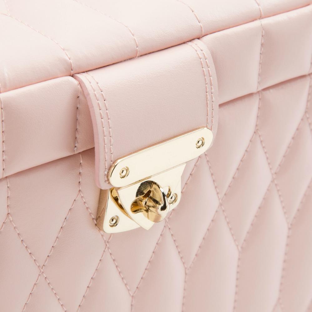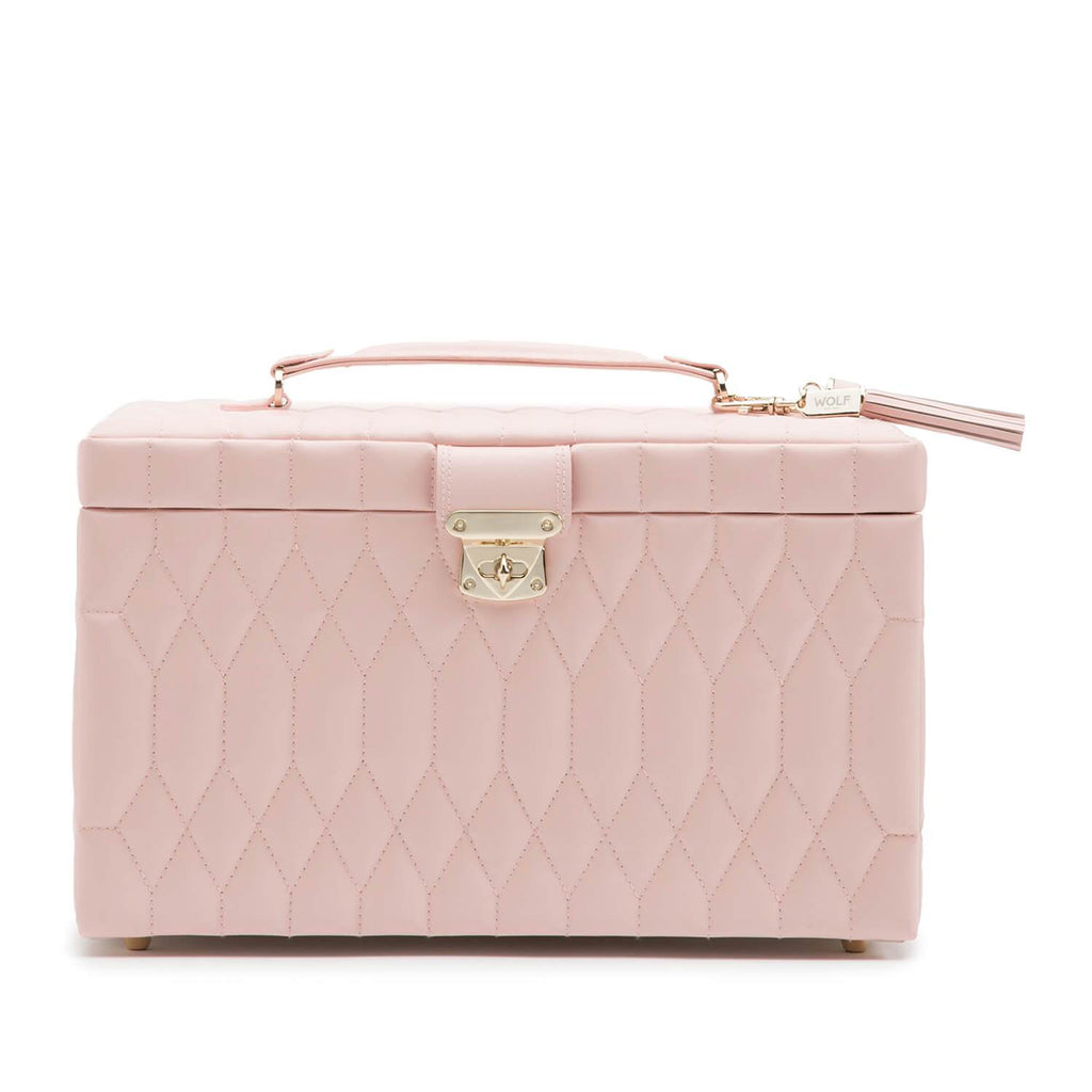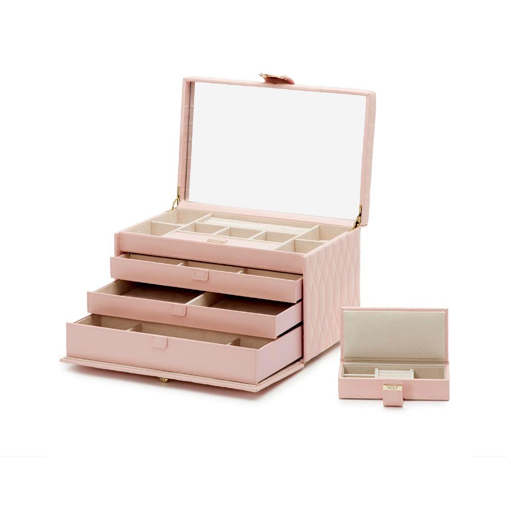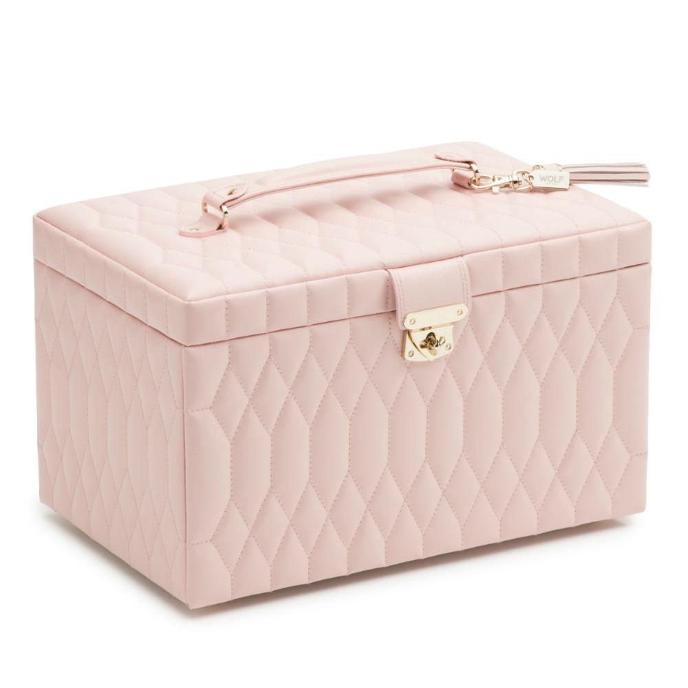The embodiment of sophistication and style. The Caroline Large Jewelry Case, a timeless classic with elegant soft lines of the 50’s, supple diamond quilted leather accented with gold hardware. This refined case is the perfect home for your precious jewelry and heirlooms.