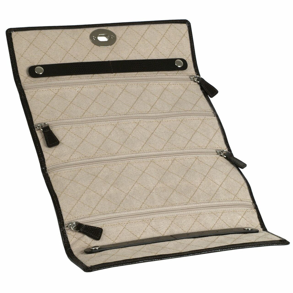 A WOLF classic for over 10 years, London embodies the tradition of box-making, the style that is timeless and the simple delight of organizing our treasures. Avoid tangles and keep your jewelry organized on the go with the classic London jewelry roll. Includes beautiful lizard embossed leather, twist lock, and patented LusterLoc™ lining.
