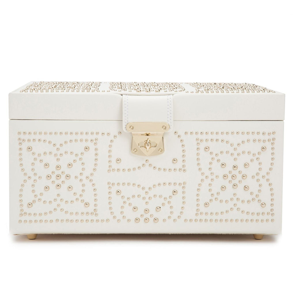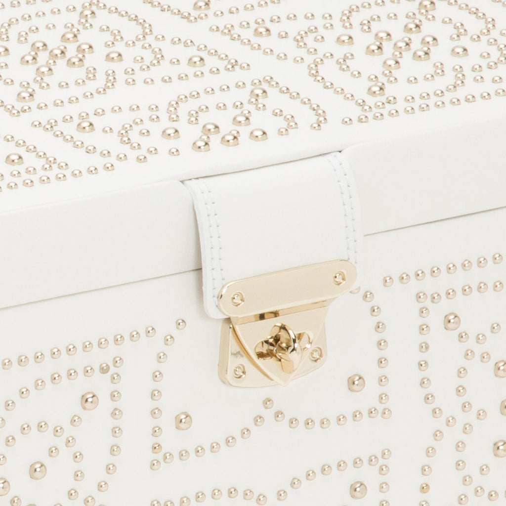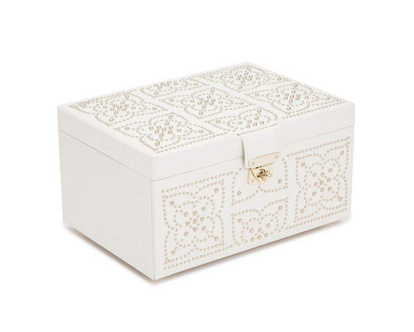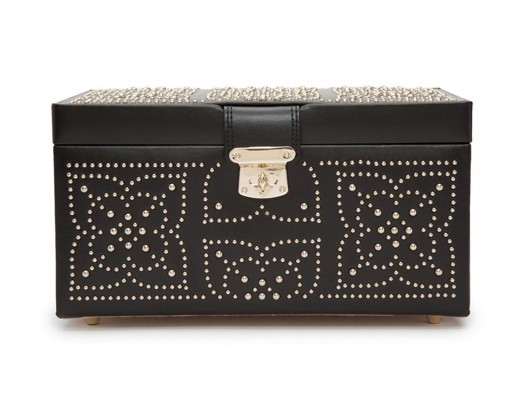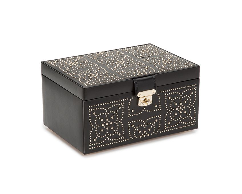 Take a trip to an exotic and intoxicating place, leather and gold studding whirling together, creating patterns within patterns. Make a statement at home with the Marrakesh Medium Jewelry box. Features intricate studs on smooth leather, full mirror, gold finished hardware, and WOLF’s patented LusterLoc™. Release the dervish in you!