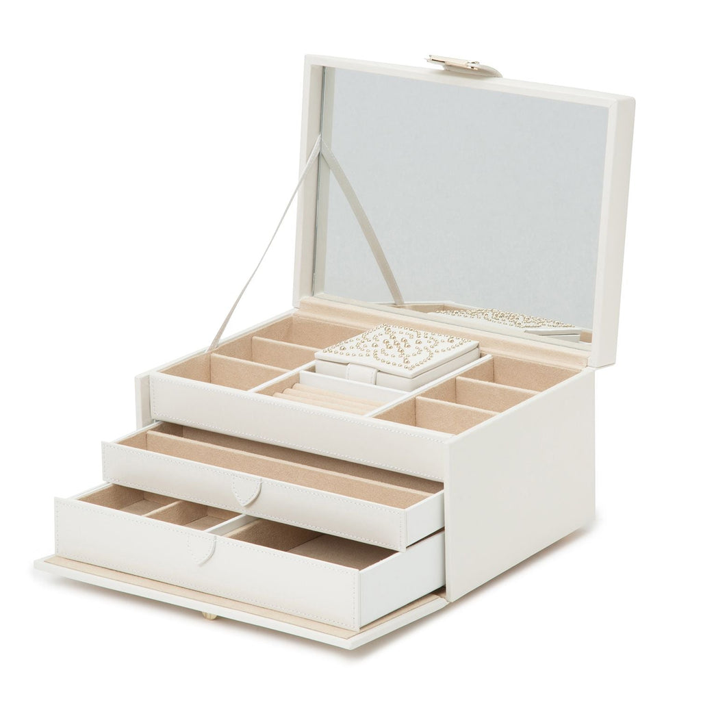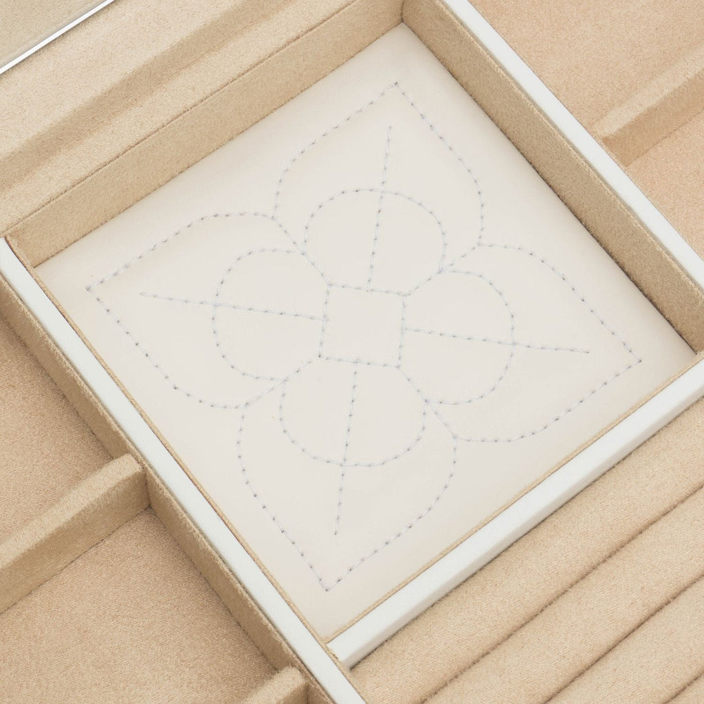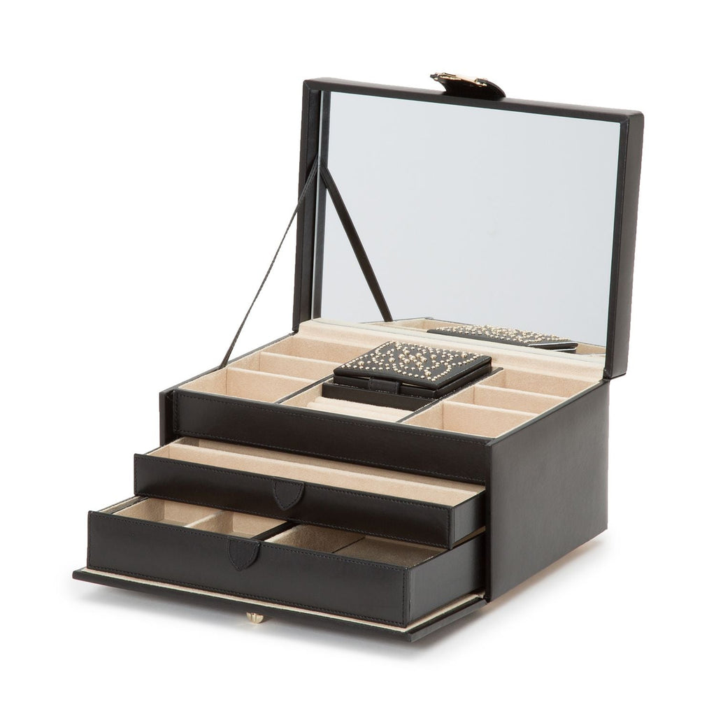 Take a trip to an exotic and intoxicating place, leather and gold studding whirling together, creating patterns within patterns. Make a statement at home with the Marrakesh Medium Jewelry box. Features intricate studs on smooth leather, full mirror, gold finished hardware, and WOLF’s patented LusterLoc™. Release the dervish in you!