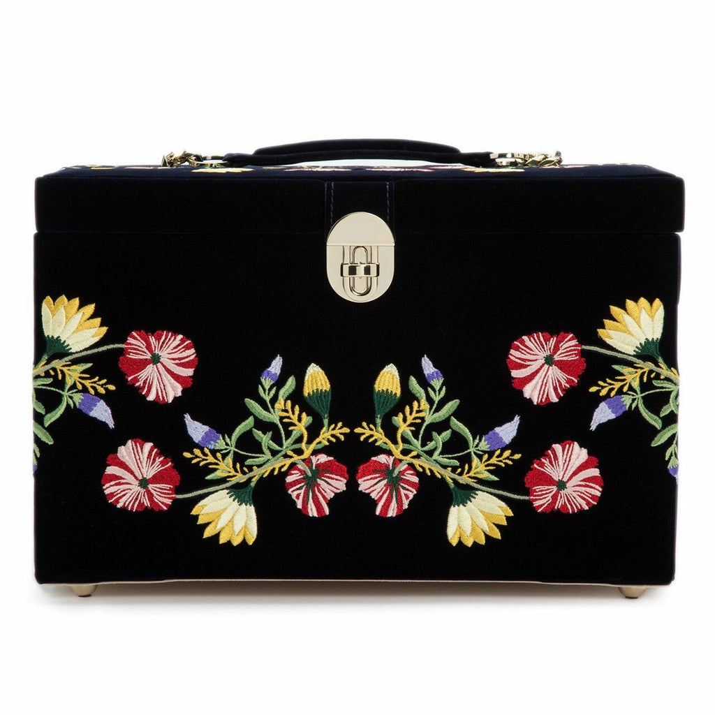 Fresh faced and fun, Zoe is sophisticated but playful. The Large case’s soft mink body highly embroidered with classic floral designs is as beautiful as its accessories inside. Includes mink velvet exterior, LusterLoc interior, pale gold hardware, and removable mini travel piece.