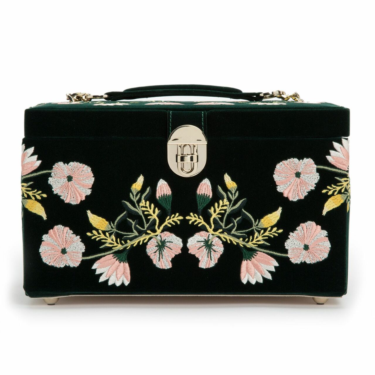 Fresh faced and fun, Zoe is sophisticated but playful. The Medium case’s soft forest green body highly embroidered with classic floral designs is as beautiful as its accessories inside. Includes velvet exterior, LusterLoc interior, pale gold hardware, and removable mini travel piece.